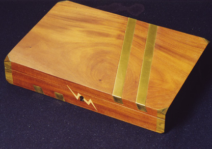 Recycled Wardrobe Mahogany. Brass strips inlaid diagonally on both sides. Holly and Bog Oak Lightning Bolt Escutcheon. Lignum vitae strengthening at corners. Brass strap hinges inside. 16" x 12" x 4"